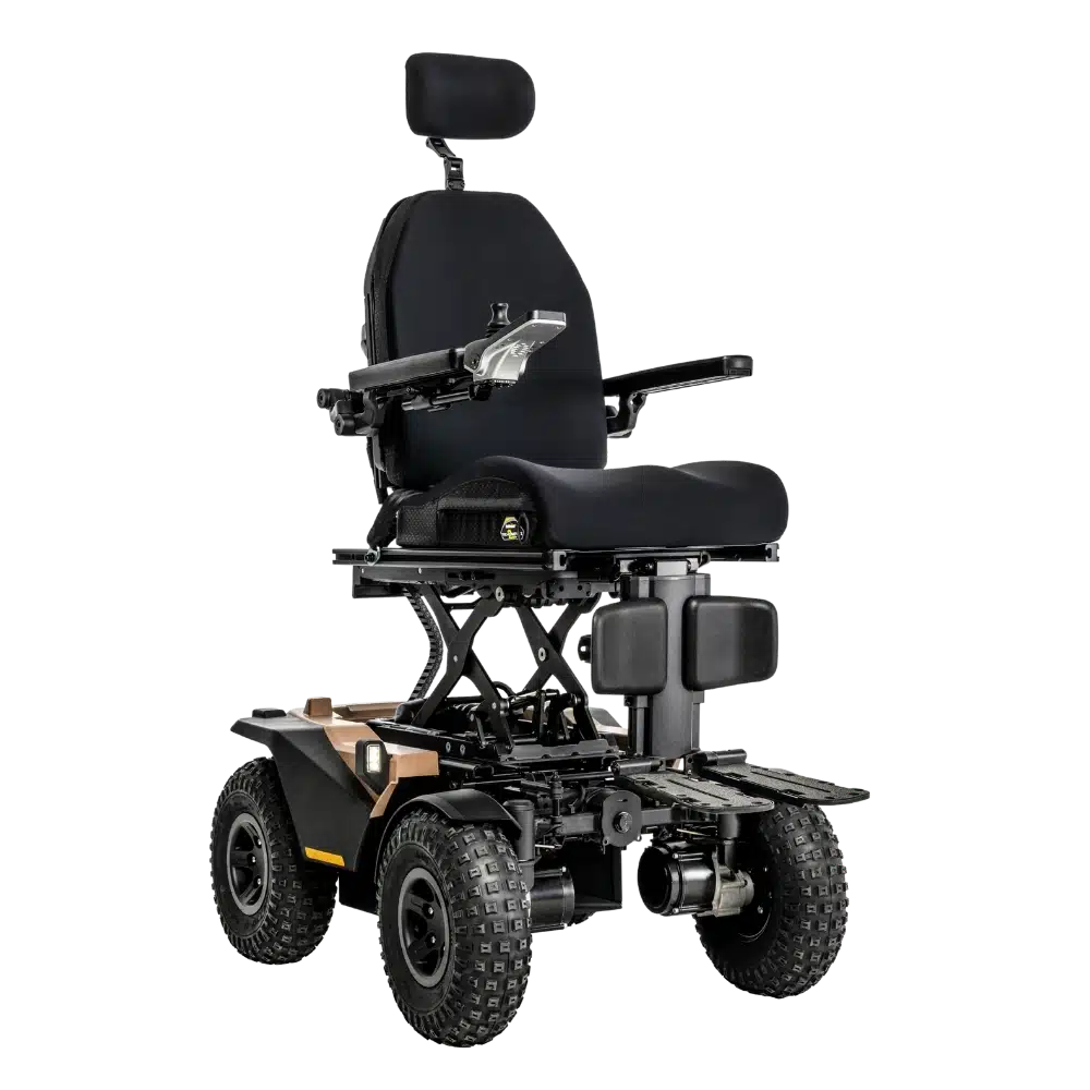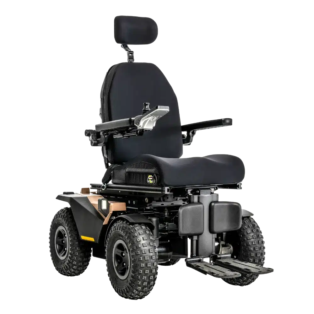 The Quantum Outback is a rugged 4×4 all-terrain powerchair built for outdoor adventure. Featuring 4-pole motors, Smooth Ride Suspension, and advanced stability, it handles wooded trails and uneven terrain with ease. Optional 10″ power-adjustable safe seat elevation lets you drive safely at up to 3,2 mp/h while elevated. With a full LED lighting package, backup camera, and new camo colour options, the Outback combines performance, safety, and style for the ultimate outdoor mobility experience.Â