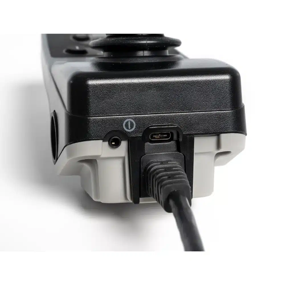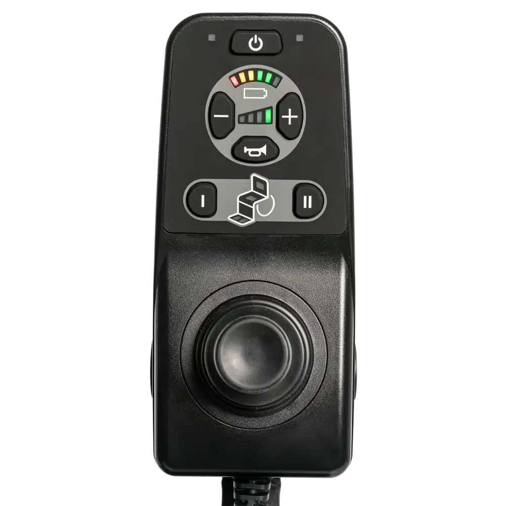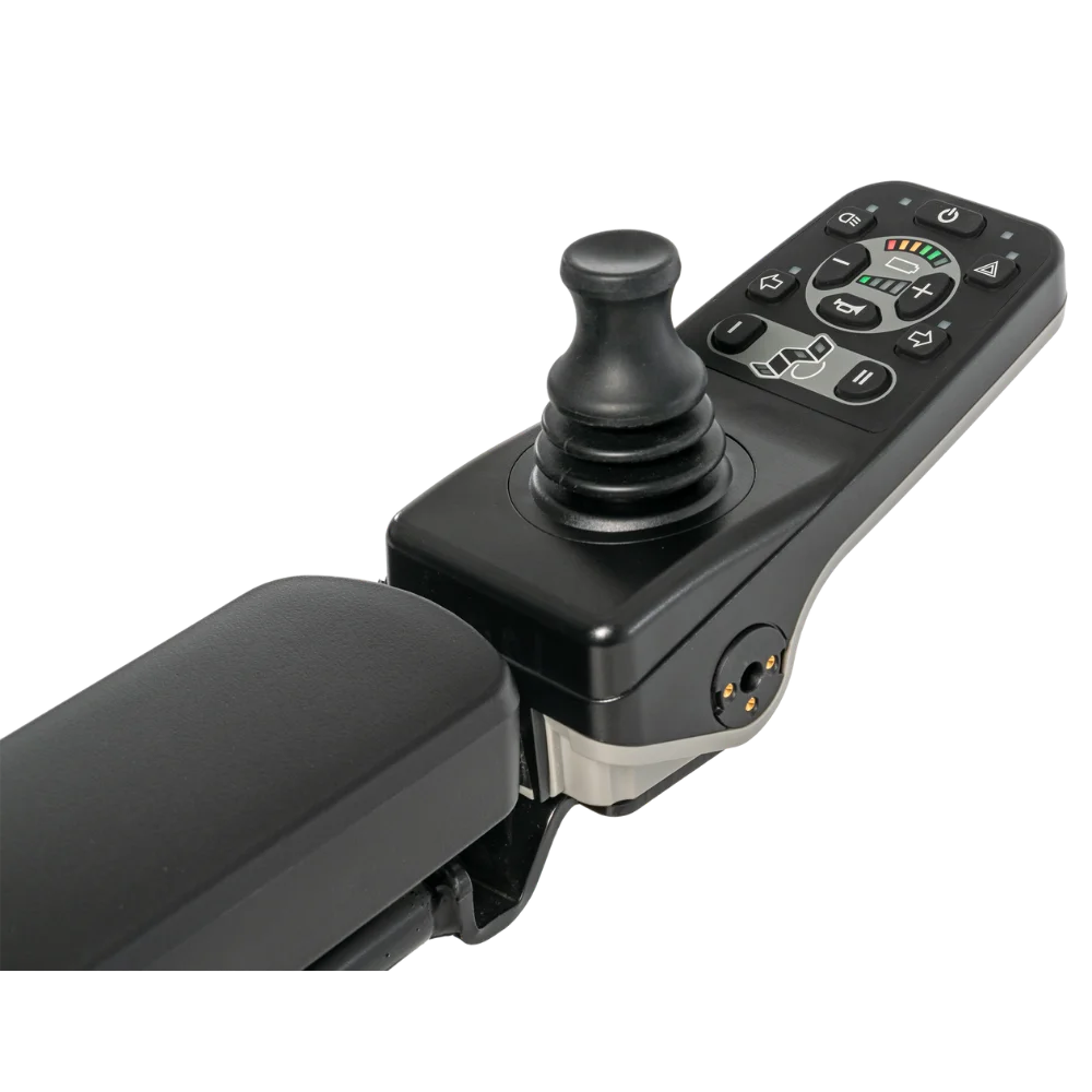 The Q-Logic NES is Quantum Rehab’s new non-expandable controller, designed for ease of use and user comfort. It features two programmable soft-touch buttons, an easy-to-read LED display, a USB-C charging port, and an ergonomic design.
